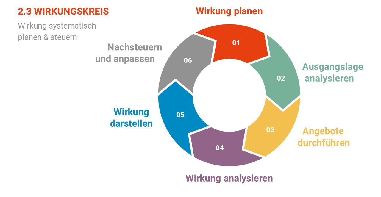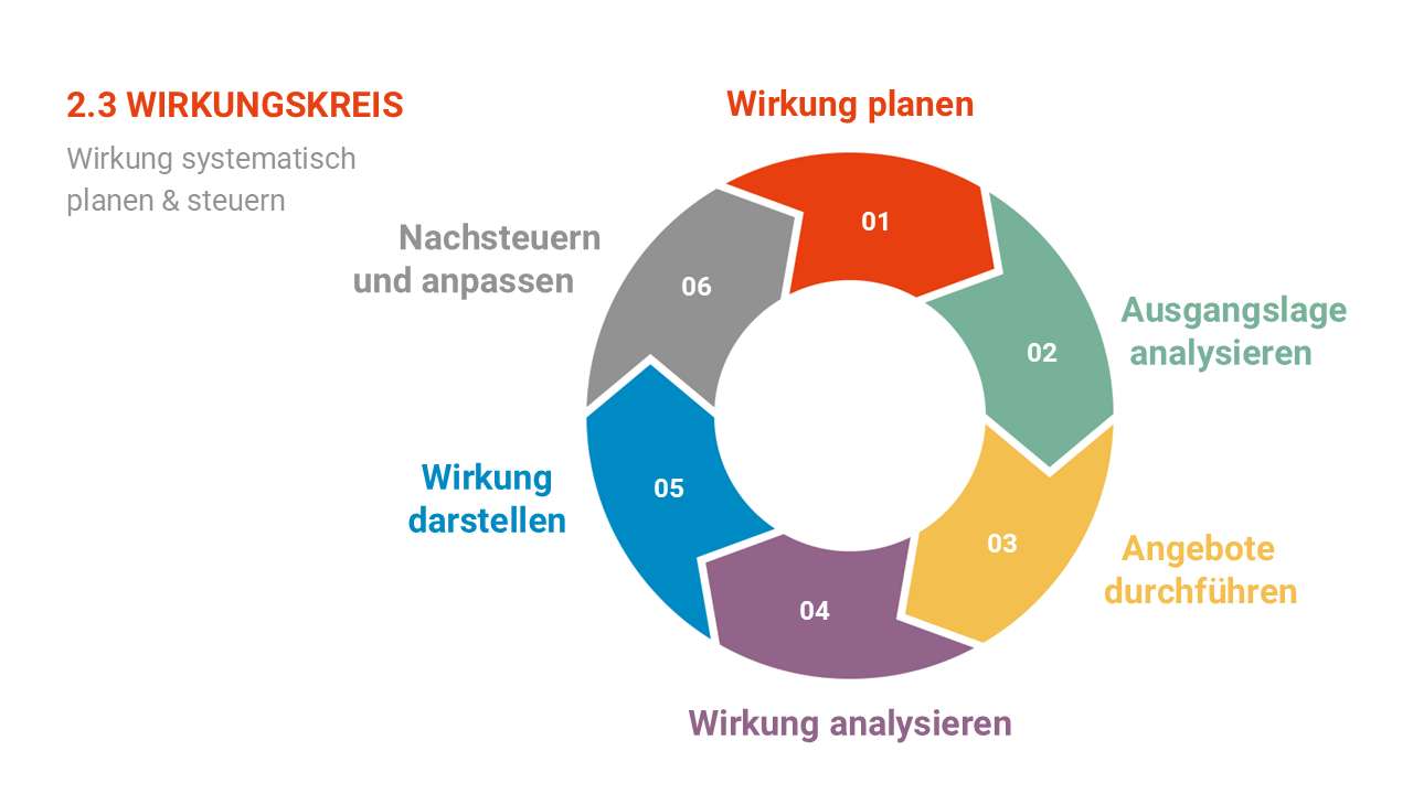 Der Wirkungskreis: Wirkung entsteht nicht zufällig. Sie lässt sich systematisch planen und steuern. Unser sechsstufiger Wirkungskreis führt von der gemeinsamen Beschreibung gesellschaftlicher Herausforderungen, der aus der Perspektive der Zielgruppe(n) abgeleiteten Planung von Wirkungszielen, über die Analyse der Ausgangslage und die Durchführung von Angeboten, bis zur empirischen Wirkungsanalyse und einer eventuellen bedarfsgerechten Anpassung. Diese wird wieder auf Wirkung hin überprüft.
