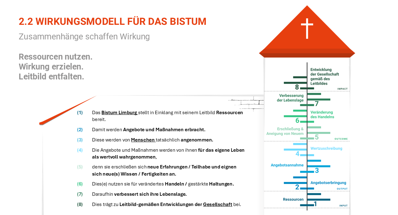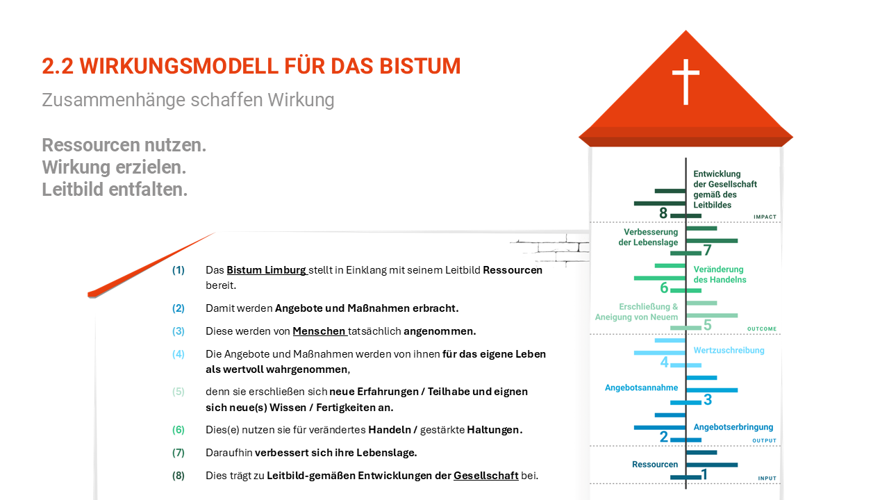 Das Wirkungsmodell: Wir verstehen Wirkung als hilfreiche Veränderung bei Menschen und in der Gesellschaft. Unser achtstufiges Modell zeigt auf, wie aus dem Einsatz von Ressourcen durch kirchliche Angebote, konkrete Veränderungen im Leben der Menschen entstehen – von neuen Erfahrungen und Kompetenzen bis hin zu gestärkten Haltungen und einer verbesserten Lebenslage. So trägt kirchliches Handeln schließlich auch zu der im Leitbild des Bistums Limburg beschriebenen Gesellschaft bei.