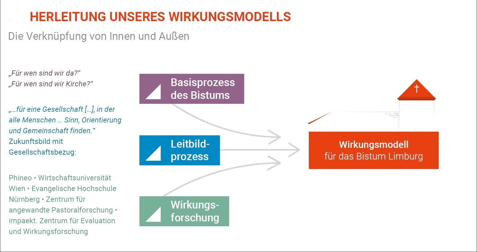 Die drei Grundlagen unseres Wirkmodells sind: der Basisprozess des Bistums Limburg, das Leitbild des Bistums Limburg und Erkenntnisses der aktuellen Wirkungsforschung. Im Basisprozess kommt das Gegenüber des Bistums in den Blick: Für wen sind wir da? Diese Frage wird im Leitbild des Bistums Limburg mit „alle Menschen“ der Gesellschaft aufgegriffen und mit den Dimensionen Gemeinschaft, Spiritualität und gesellschaftliche Verantwortung um ein Zukunftsbild ergänzt. Die aktuelle Wirkungsforschung (bspw. PHINEO) gibt Hinweise auf Zusammenhänge: Wie entsteht aus Ressource und Leistung eine lebensfördernde Veränderung im Alltag der Menschen? Wie lassen sich diese Veränderungen nutzen, um Gesellschaft zu entwickeln?